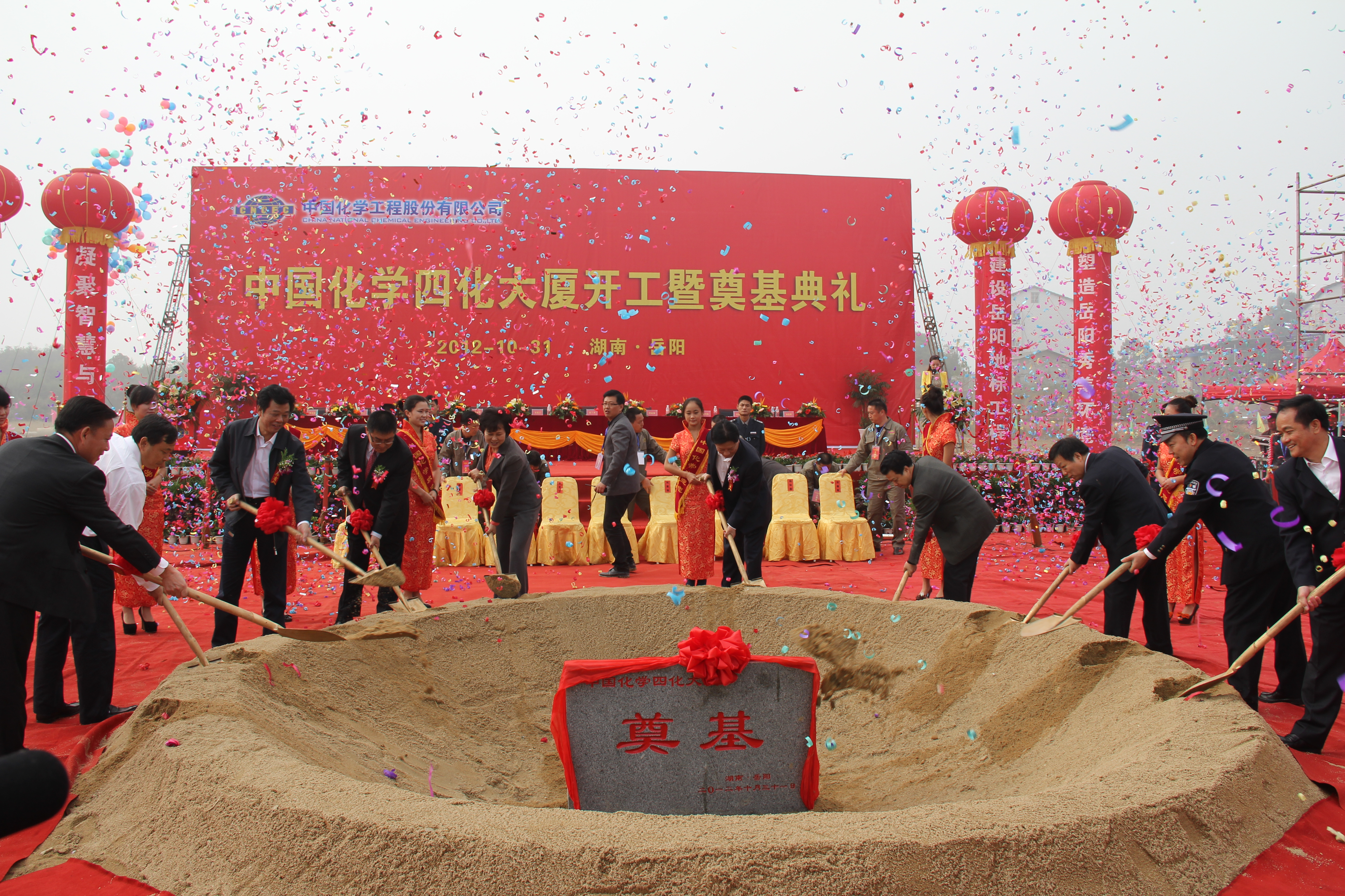 中國(guó)化學(xué)工程集團(tuán)公司黨委書記、總經(jīng)理、中國(guó)化學(xué)工程股份有限公司黨委書記、董事長(zhǎng)金克寧出席儀式。岳陽(yáng)市委書記黃蘭香宣布“中國(guó)化學(xué)四化大廈開工”。岳陽(yáng)市委副書記、市長(zhǎng)盛榮華,中國(guó)化學(xué)工程股份有限公司黨委常委、副總經(jīng)理劉家強(qiáng),岳陽(yáng)市經(jīng)濟(jì)技術(shù)開發(fā)區(qū)工委書記胡知榮,公司黨委書記、董事長(zhǎng)劉德輝等先后在儀式上致辭。岳陽(yáng)市委常委、市委秘書長(zhǎng)樊進(jìn)軍,岳陽(yáng)市委常委、副市長(zhǎng)陳四海,岳陽(yáng)市政府副廳級(jí)干部、市公安局局長(zhǎng)丁陽(yáng)云共同出席儀式,并為四化大廈鏟土奠基。開工奠基儀式由岳陽(yáng)市經(jīng)濟(jì)技術(shù)開發(fā)區(qū)工委副書記、管委會(huì)主任劉美樹主持。
