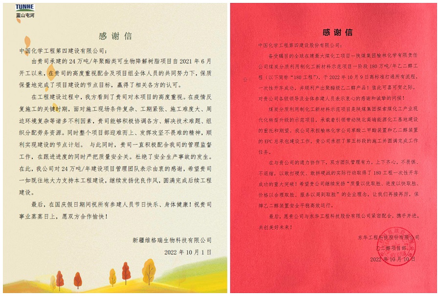 新疆藍(lán)山屯河等多家業(yè)主向公司發(fā)來感謝信